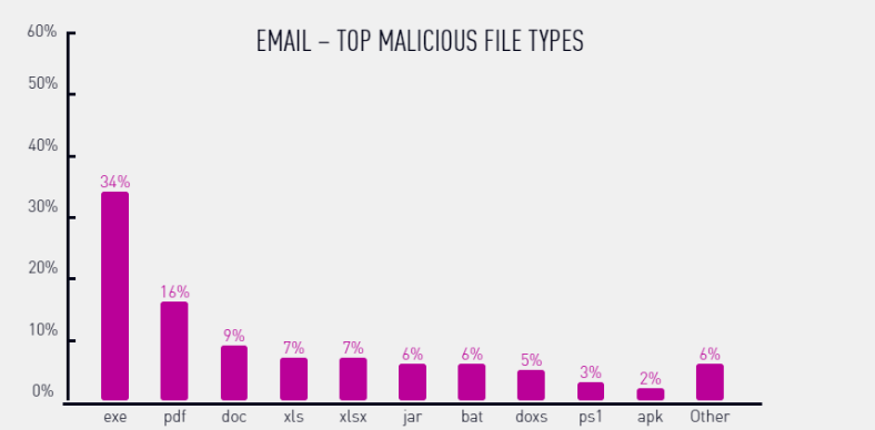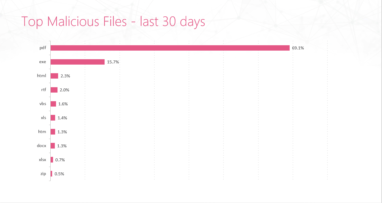 - Les services de santé sont les plus touchés, puisque 83 % de tous les fichiers malveillants sont des PDF.