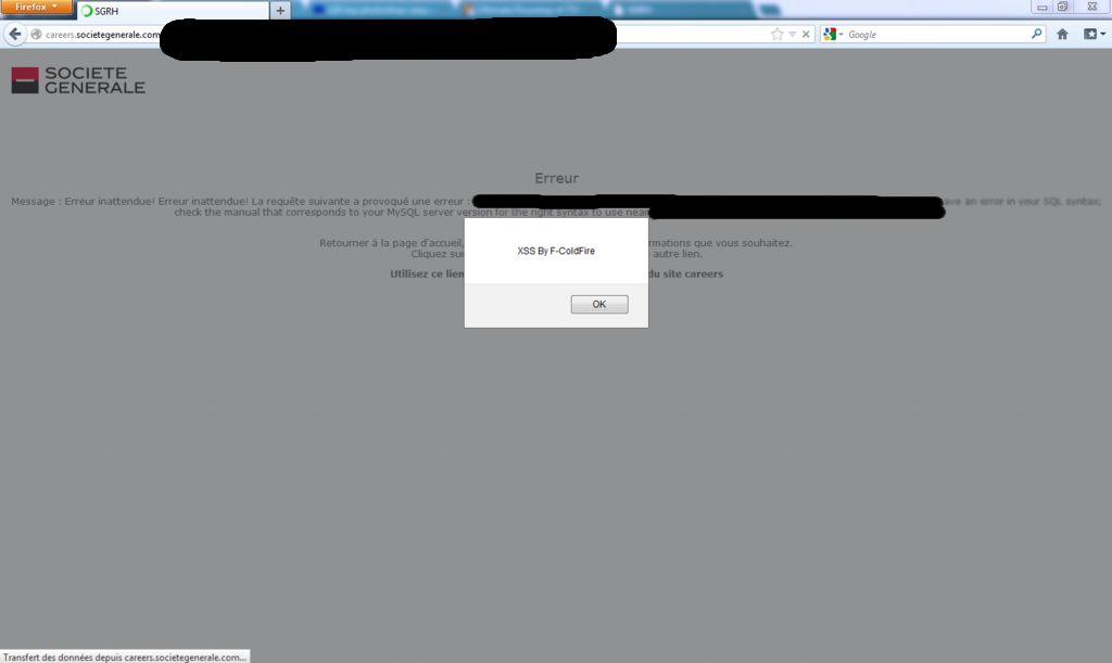 D’après l’image diffusée, la vulnérabilité XSS (Cross Site Scripting) se situerait sur le sous domaine careers.societegenerale.com…