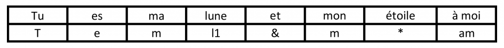Cet exemple simple s’appuie sur une phrase plutôt basique, idiote et romantique à la fois : « Tu es ma lune et mon étoile à moi ». Faites votre substitution :