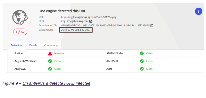 - URL qui hébergeait l’image malveillante : un antivirus a signalé l’existence d’un malware (Figure 9).