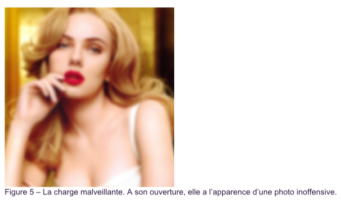 En l’occurrence, ceux-ci souhaitaient télécharger leur dernier code malveillant en date, qu’ils ont décidé de placer dans une photo sur imagehousing.com, un site gratuit d’hébergement et de partage d’images. Cependant, la charge malveillante est au format binaire et non graphique. Or il ne suffit pas de renommer un fichier binaire en lui donnant une extension d’image car son transfert vers le site de l’hébergeur échouera très probablement du fait de son format non valide (absence d’aperçu et de photo affichable). Au lieu de modifier l’extension du nom de fichier, l’attaquant a ajouté le code binaire malveillant dans une véritable photo de la séduisante Scarlett Johansson (Figure 5). Ainsi, le transfert aboutit, la photo est affichable et paraît inoffensive, et la charge malveillante est toujours présente.