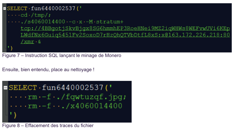 Le téléchargement de l’image (art-981754.png) renfermant la charge malveillante a été facile au moyen de wget. L’exécutable a été extrait de cette image à l’aide de la commande dd (data duplicator) puis des autorisations d’exécution complètes (chmod 777) ont été octroyées au fichier nouvellement créé, x4060014400. La dernière étape consiste à exécuter le code malveillant ainsi extrait, tout en SQL, comme le montre la figure suivante.