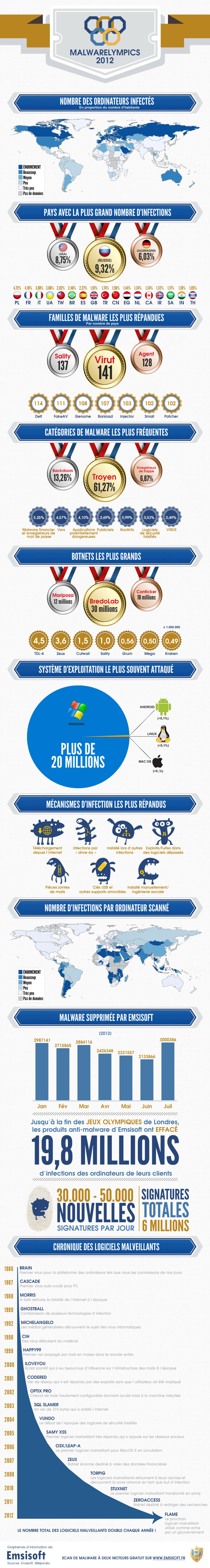 La société Emsisoft, éditrice du logiciel de sécurité anti-malware du même nom présente aujourd’hui une infographie très complète et bien sympathique sur les malwares de 2012. Qui va être le grand gagnant des Malwarelympics 2012 ?