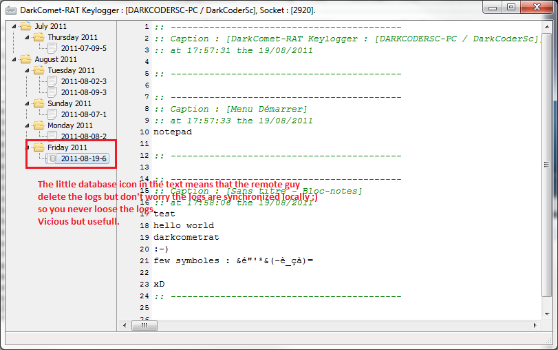 - Un système de gestion de base de données local qui permet de synchroniser pas mal de données entre les sessions d’utilisation de DarkComet
