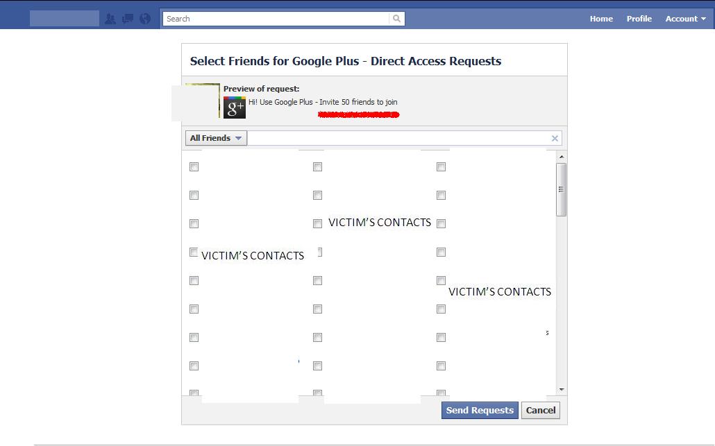Première étape, la classique demande d’autorisation. Beaucoup de demandes d’accès pour une simple invitation ? Voyons cela de plus prés : cette application pourra vous envoyer un email, avoir accès à toutes vos données personnelles et à votre profil… Ca vaut peut être le coup de commencer à vous inquiéter lorsque vous constatez qu’une application vous demande autant d’accès …alors qu’elle ne devrait qu’inviter que vos amis. S’inquiéter ? Pourquoi ? Alleeez, on continue et on clique sur « Autoriser ».