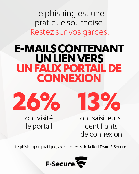 Certaines entreprises font trop confiance aux nouvelles technologies et deviennent, de fait, vulnérables aux cyberattaques de type phishing, qui tirent profit de faiblesses dites humaines. L’expérience de la Red Team F-Secure le prouve : 52% des employés sont susceptibles de cliquer sur le lien d’un e-mail malveillant.