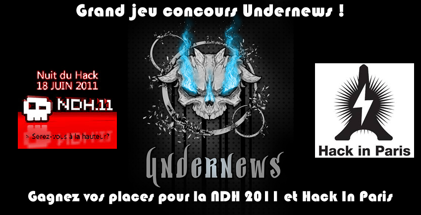@UnderNews_fr Grand jeu-concours, des places pour la Nuit Du Hack 2011 et des réductions pour Hack In Paris à gagner ! http://bit.ly/hBWFjr